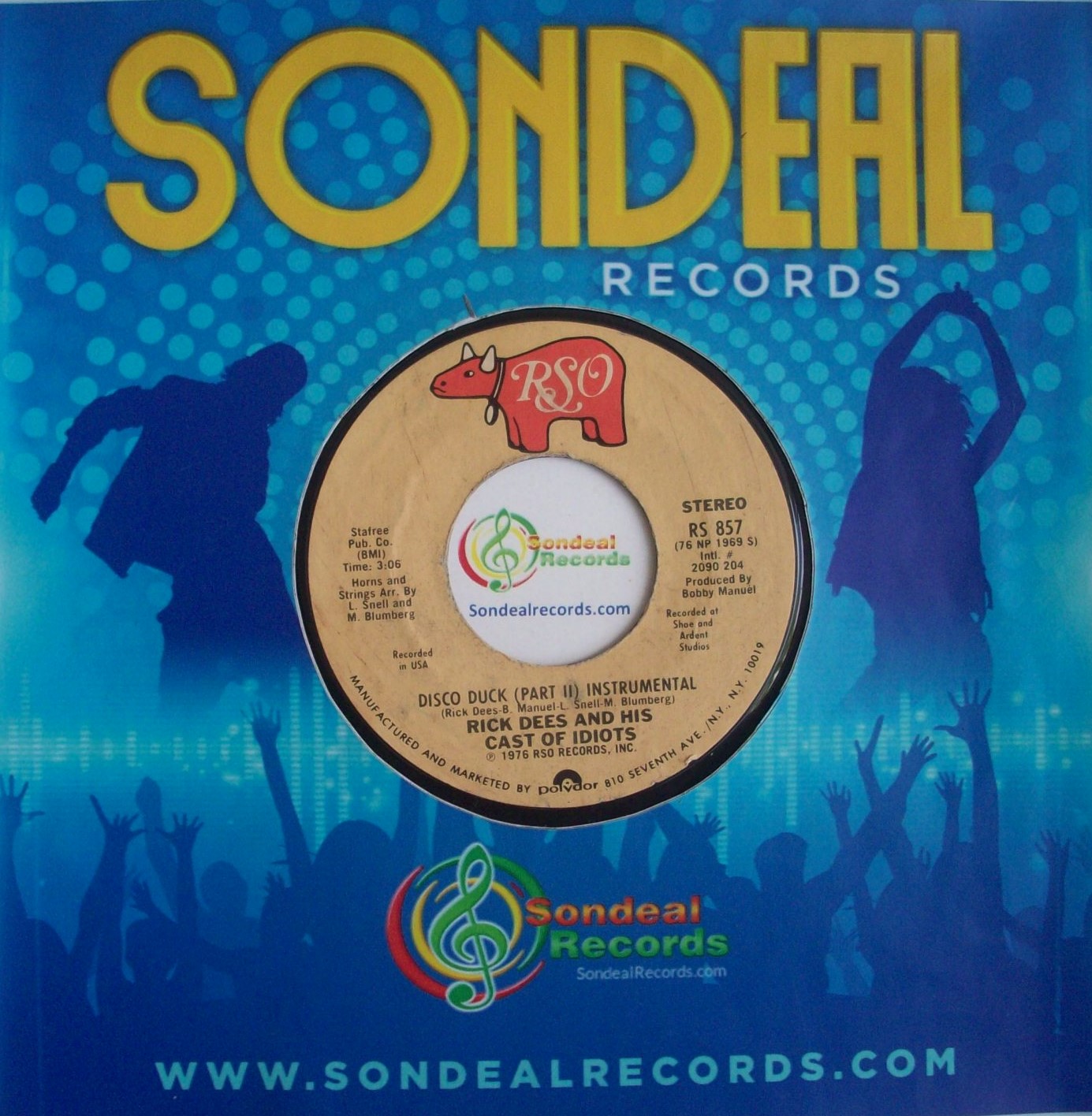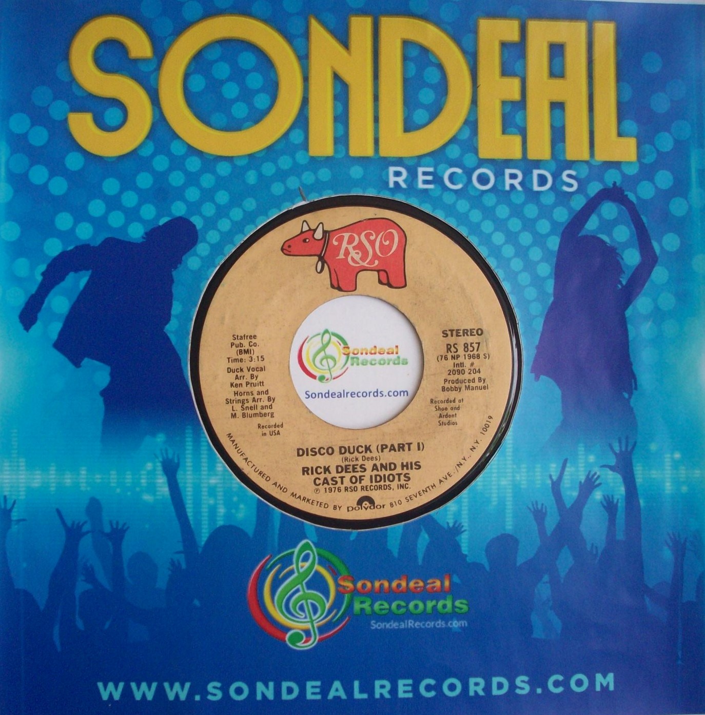 ITEM: 24377ARTIST: RICK DEES AND IS CAST OF IDIOTSTITLE: Disco DuckLABEL: RSOCATALOG #: RS 857SPEED: 45 RPMFORMAT: 7''ATTRIBUTES: NONEGRADES: [VG++] Very Very Good PlusGENRE: Disco / DanceSUB-GENRE: Dance / Disco / DJDURATION: SingleORIGIN: Made in USA - Original PressPRODUCER: Bobby ManuelRELEASE YEAR: 1976